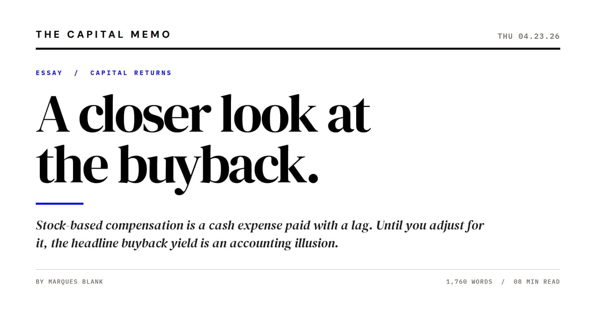 Consider a company that announces $20 billion in annual buybacks against a $2 trillion market cap. The headline yield is 1.0 percent. Now consider that the same company issues $12 billion in stock-based compensation each year. The buyback, net of SBC dilution, is $8 billion. The adjusted yield is 0.4 percent. The reported number overstates the actual capital return by a factor of roughly two and a half. The hyperscaler pattern illustrates the point. Alphabet's stock-based compensation ran at roughly six to seven percent of revenue in 2023 and 2024, on the order of twenty-two to twenty-three billion dollars against revenue approaching three hundred fifty billion. Meta and Microsoft sit on a similar spectrum, with SBC programs that consume a meaningful fraction of operating cash flow. The buyback programs at each of these companies are real, and so is the economic pressure from SBC that offsets them. The observation is about how headline buyback numbers should be read, not a criticism of any of the underlying businesses, which are among the most productive generators of free cash flow in the global economy. The contrast with lower-SBC businesses is instructive. Texas Instruments and the industrials covered in Monday's piece run SBC at roughly one to two percent of revenue. Each dollar spent on repurchases there translates, more or less directly, into a dollar of retained shareholder value. The high-SBC programs cannot claim the same arithmetic. |