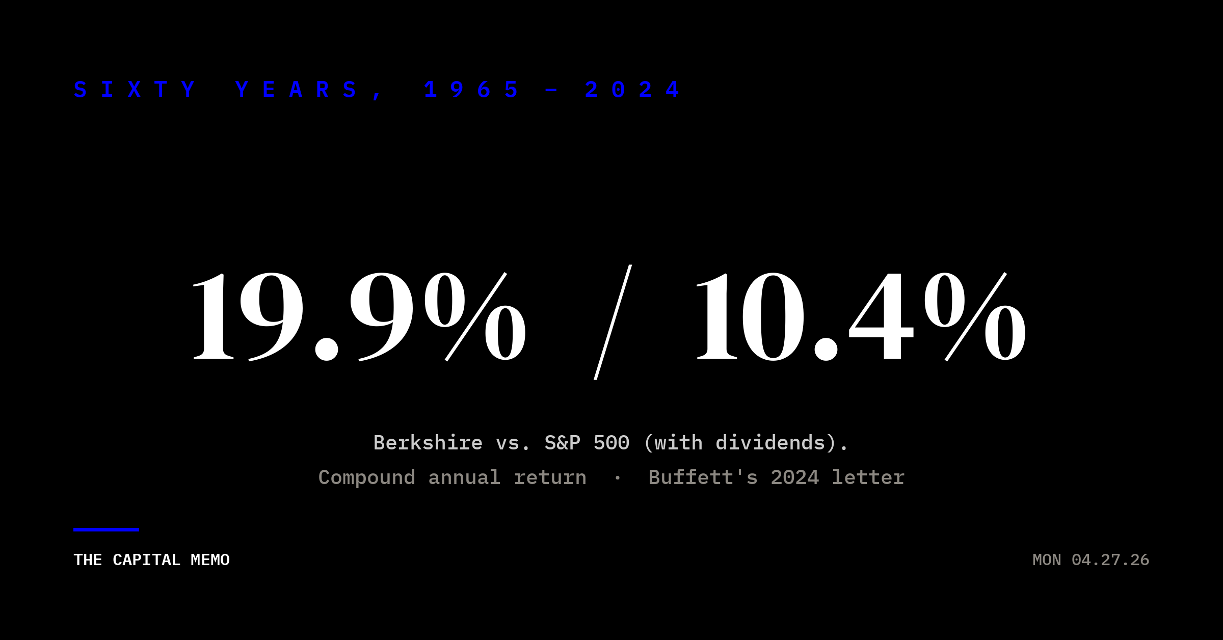 | Sixty years, 1965 – 2024 19.9% / 10.4% Berkshire compound annual market value vs. S&P 500 with dividends. Buffett's 2024 letter. |