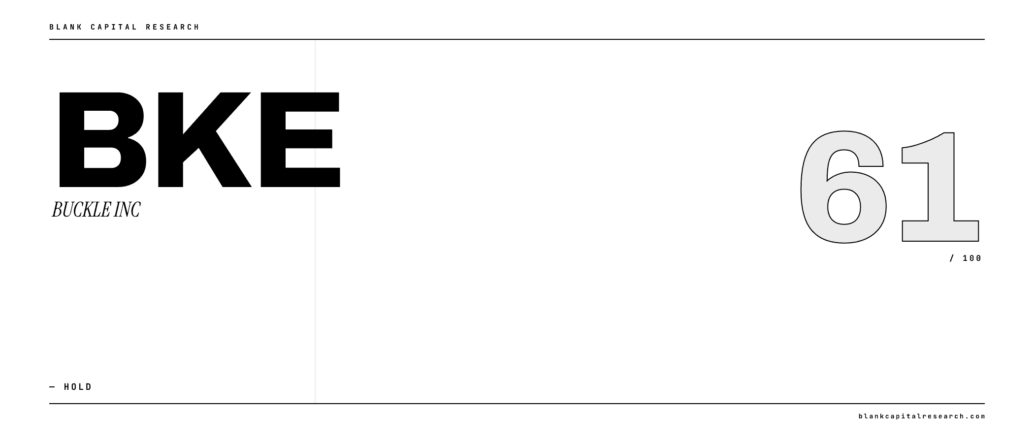 In summary, BUCKLE INC receives a Hold rating with a composite score of 62.7/100 (rank #448 of 7,333). Our quantitative framework assigns a Narrow Moat (49/100, trend: stable), Medium uncertainty, and Standard capital allocation. The average factor score across quality, value, momentum, stability, and investment is 65/100.