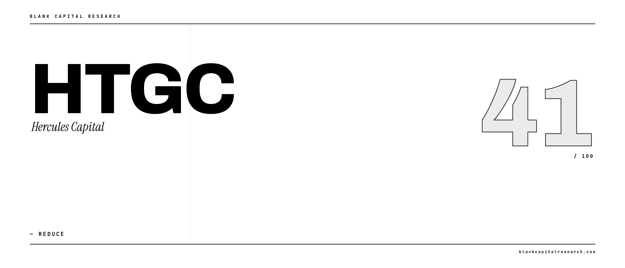 $HTGC Hercules Capital, Inc. | 40 | 28 | 46 | 53 | 3.9x | 8.1x | 33.6% | 16.7% | 56.0% | 44.0% | 88.5% | -32.6% | 10.0% | 98.0x | $3.4B | ||