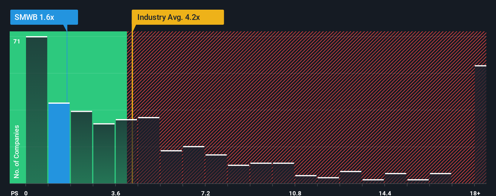 Similarweb Ltd.'s (NYSE:SMWB) shares have significantly declined by 27% in the last month and 69% over the past year, reflecting investor concerns. The company's low price-to-sales (P/S) ratio of 1.6x, compared to an industry average of 4.2x, is attributed to below-average revenue growth and a forecast for weaker future growth relative to its industry. Analysts predict only 14% revenue growth for Similarweb, while the industry is expected to grow by 33%, leading to investor pessimism and a depressed stock valuation.
