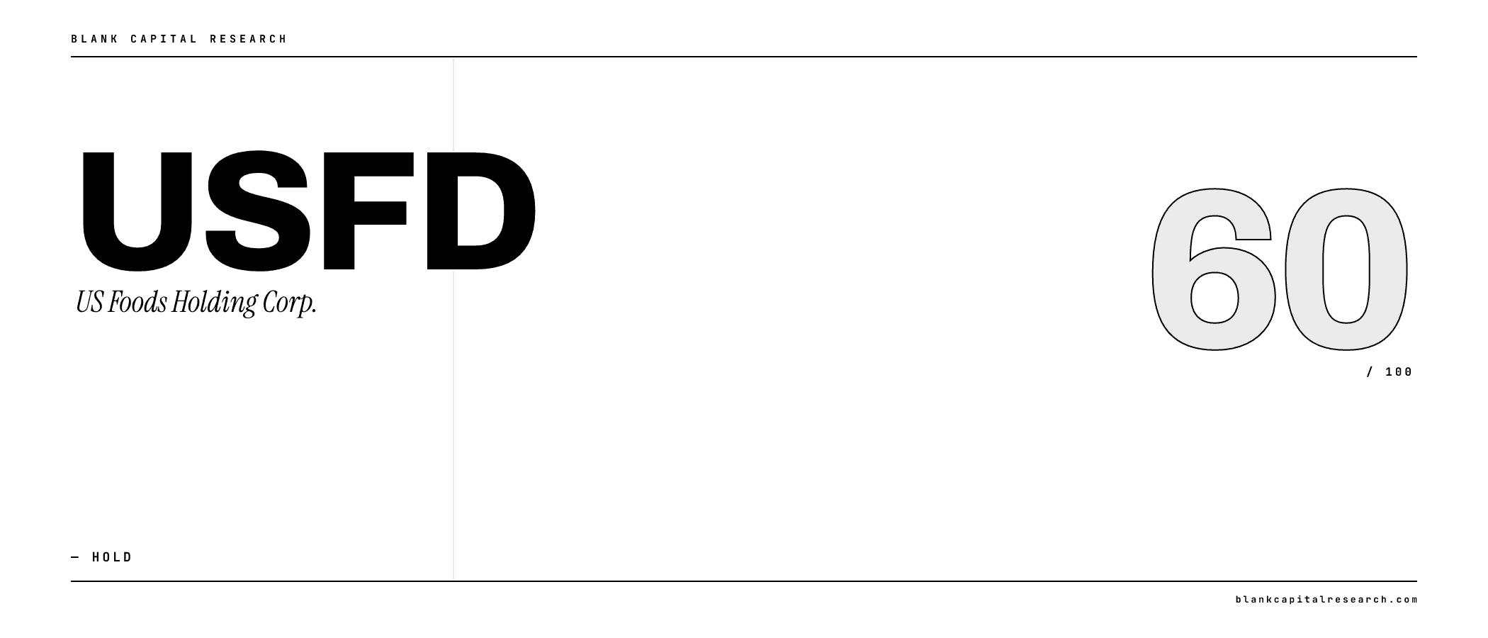 In summary, US Foods Holding Corp. receives a Hold rating with a composite score of 59.2/100 (rank #771 of 7,333). Our quantitative framework assigns a Narrow Moat (56/100, trend: stable), Medium uncertainty, and Poor capital allocation. The average factor score across quality, value, momentum, stability, and investment is 59/100.