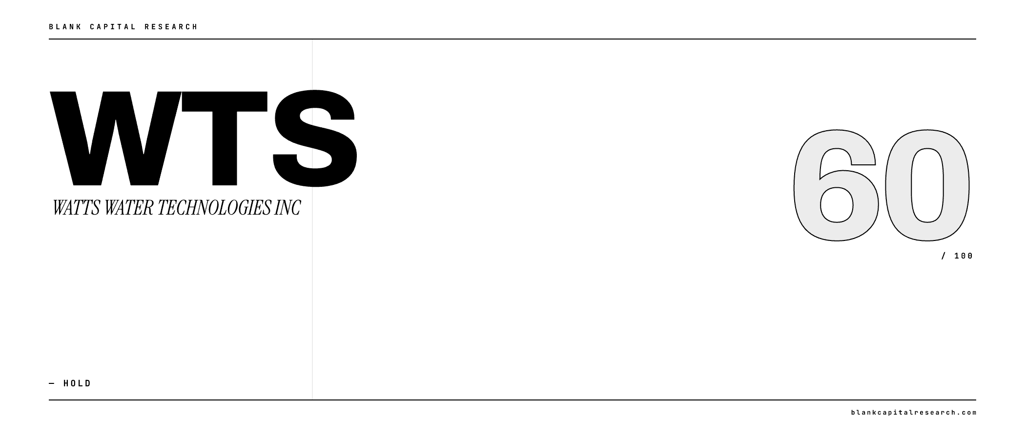 WATTS WATER TECHNOLOGIES INC (WTS) receives a "Hold" rating with a composite score of 59.8/100. It ranks #705 out of 7,333 stocks in our coverage universe and carries a 3-star rating. Ratings are driven by a 6-factor quantitative model measuring quality, value, momentum, investment, stability, and short interest.